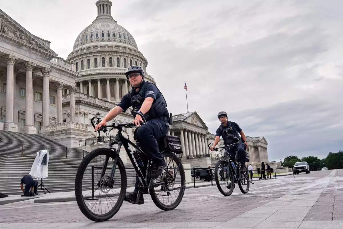 U.S. Capitol Police patrol the plaza as House Republicans work inside to pass President Donald Trump's signature bill of tax breaks and spending cuts by a self-imposed Fourth of July deadline, at the Capitol in Washington, Wednesday, July 2, 2025. (AP Photo/J. Scott Applewhite)