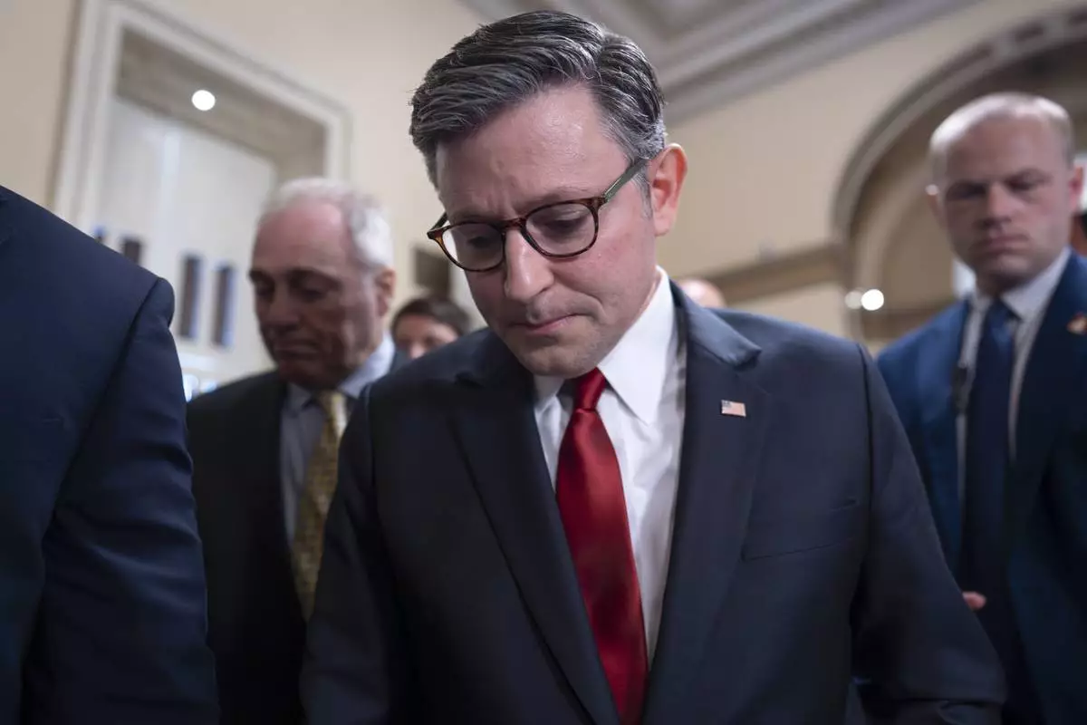 Speaker of the House Mike Johnson, R-La., walks behind his security detail through a crowd of reporters as he tries to push President Donald Trump's signature bill of tax breaks and spending cuts across the finish line even as conservative and moderate GOP holdouts slow that effort, at the Capitol in Washington, Wednesday, July 2, 2025. (AP Photo/J. Scott Applewhite)
