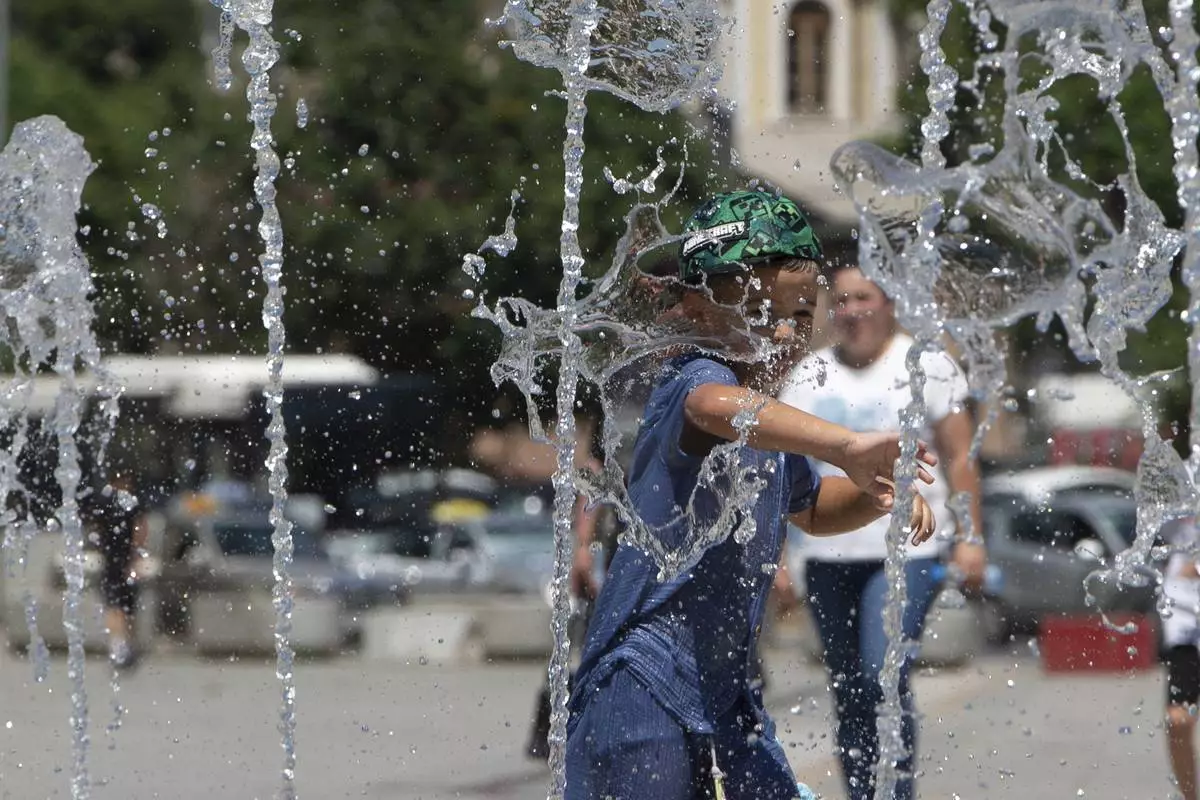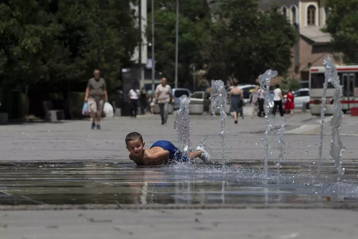 A boy plays in a fountain during hot weather in Kosovo's capital Pristina on Thursday, July 3, 2025. (AP Photo/Visar Kryeziu)