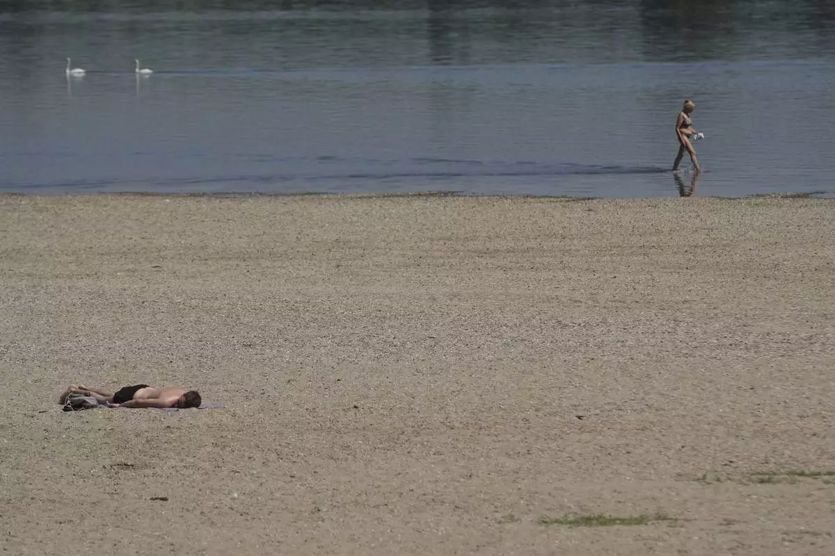 A woman wades through the Danube river as a man lies sunbathing on the bank during a hot summer day in Belgrade, Serbia, Thursday, July 3, 2025. (AP Photo/Darko Vojinovic)