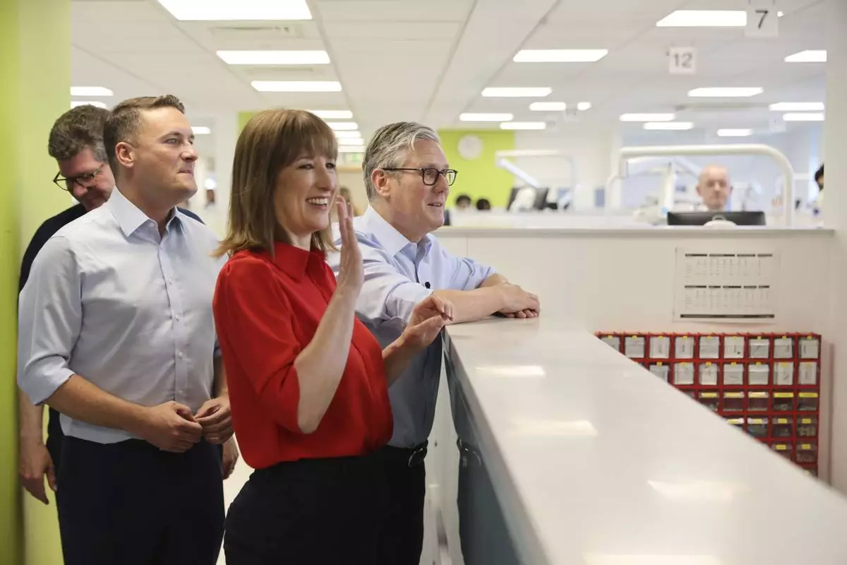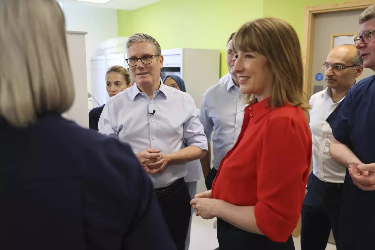 Britain's Prime Minister Keir Starmer, center, Chancellor Rachel Reeves during a visit to the Sir Ludwig Guttman Health & Wellbeing Centre in east London, Thursday, July 3, 2025. (Jack Hill/Pool Photo via AP)
