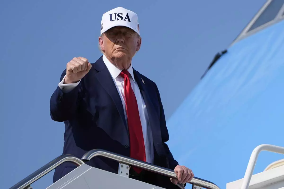 President Donald Trump gestures as he boards Air Force One, Thursday, July 3, 2025, at Joint Base Andrews, Md. (AP Photo/Alex Brandon)