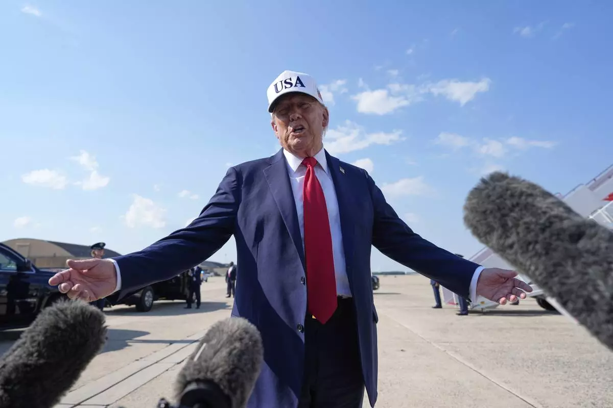 President Donald Trump talks to reporters before boarding Air Force One, Thursday, July 3, 2025, at Joint Base Andrews, Md. (AP Photo/Alex Brandon)