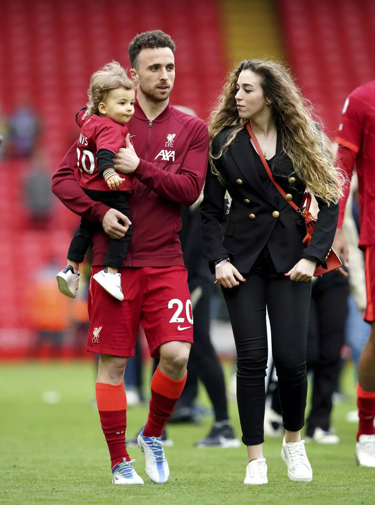 FILE - Liverpool's Diogo Jota walks the pitch with his family after the Premier League match at Anfield, Liverpool, Sunday May 22, 2022. (Peter Byrne/PA via AP, File)