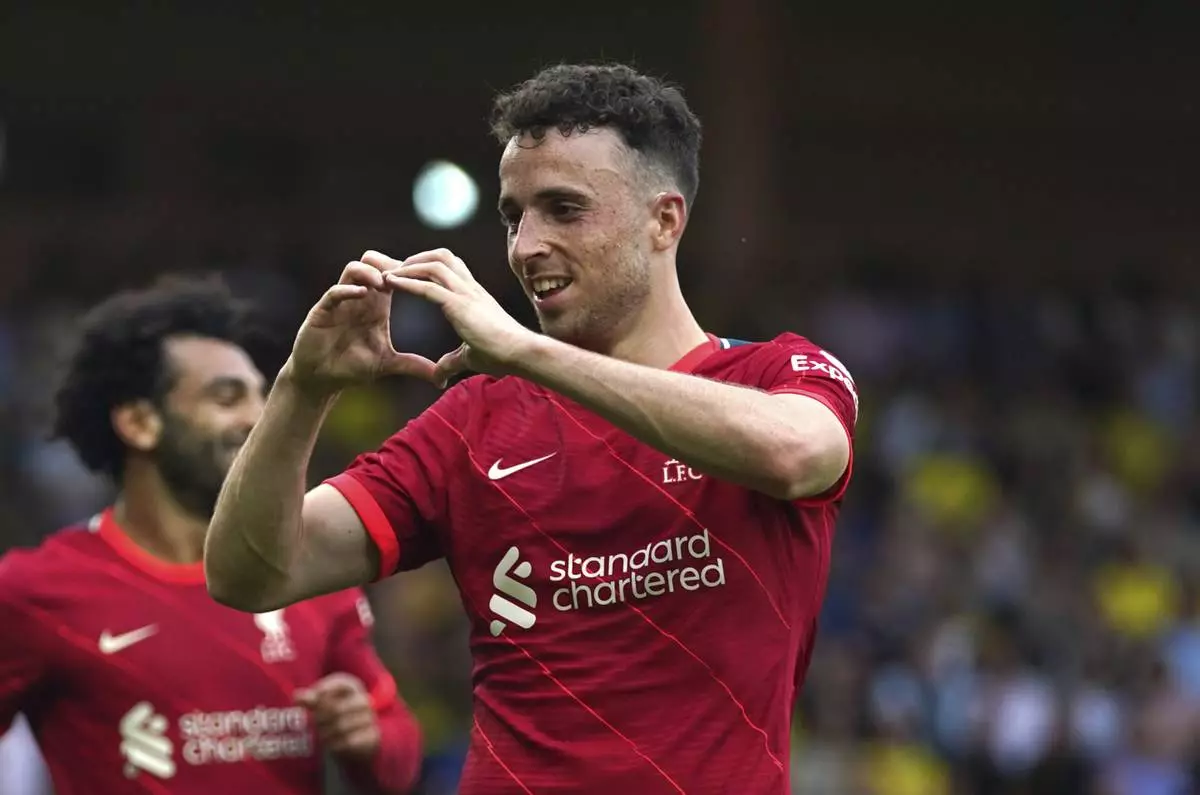 FILE - Liverpool's Diogo Jota celebrates scoring during the Premier League match at Carrow Road, Norwich, Saturday Aug. 14, 2021. (Joe Giddens/PA via AP, File)