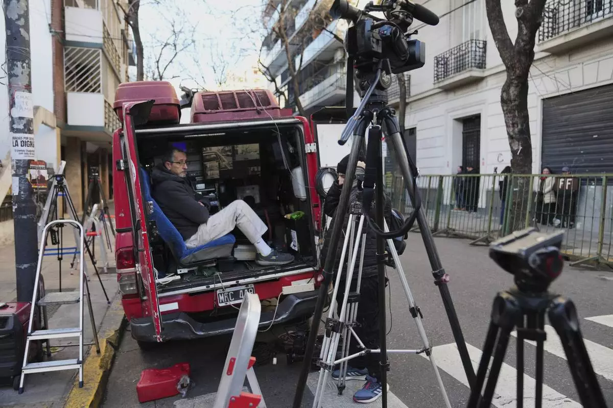 Journalists waits outside the home of former President Cristina Fernandez, who is under house arrest serving a six-year prison sentence for corruption, for the arrival of Brazil's President Luiz Inacio Lula da Silva in Buenos Aires, Argentina, Thursday, July 3, 2025. (AP Photo/Rodrigo Abd)