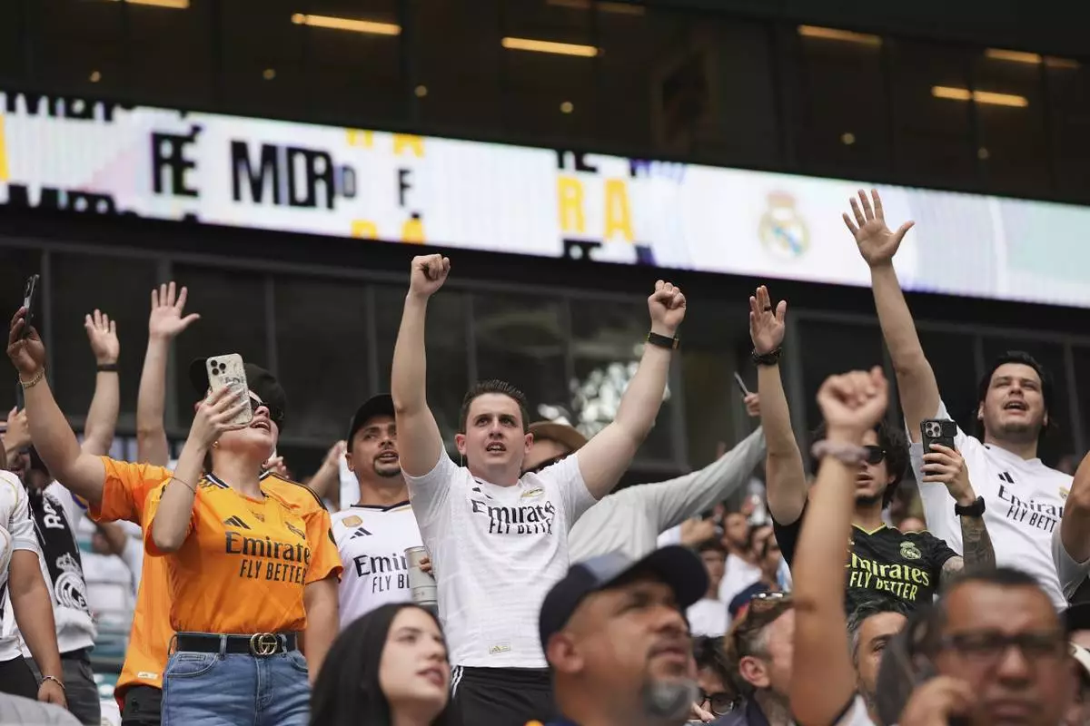 Real Madrid fans cheer their team before the Club World Cup round of 16 soccer match between Real Madrid and Juventus in Miami Gardens, Fla., Tuesday, July 1, 2025. (AP Photo/Lynne Sladky)