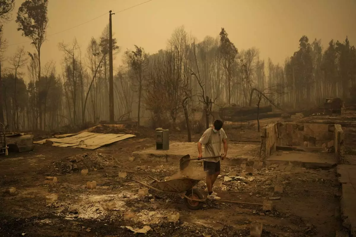 FILE - Yeremy Escanilla works on cleaning the debris of the remains of his house, destroyed by wildfires in Santa Juana, Chile, Feb. 5, 2023. (AP Photo/Matias Delacroix, File)