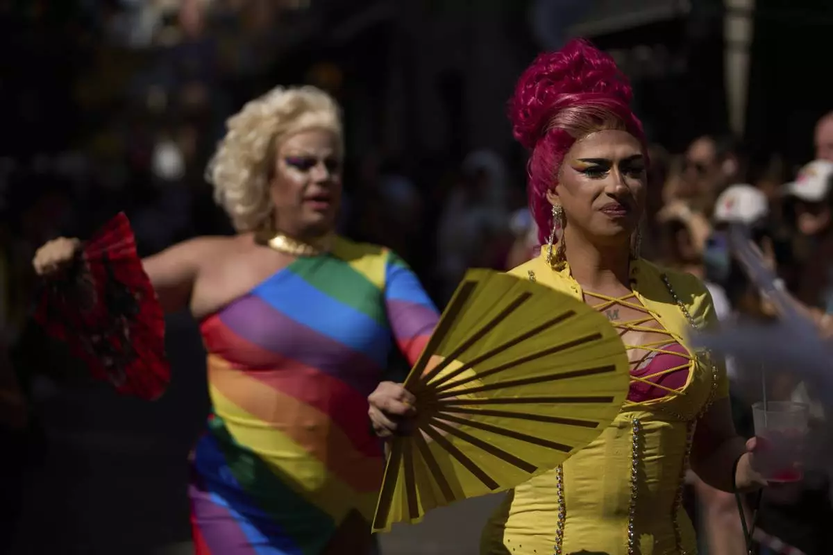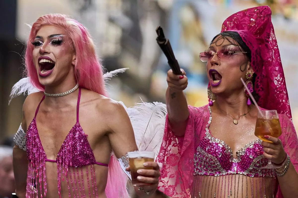 People in drag take part in festivities and preparations ahead of the annual high heel race during Madrid's Pride week in Madrid, Thursday, July 3, 2025. (AP Photo/Manu Fernandez)