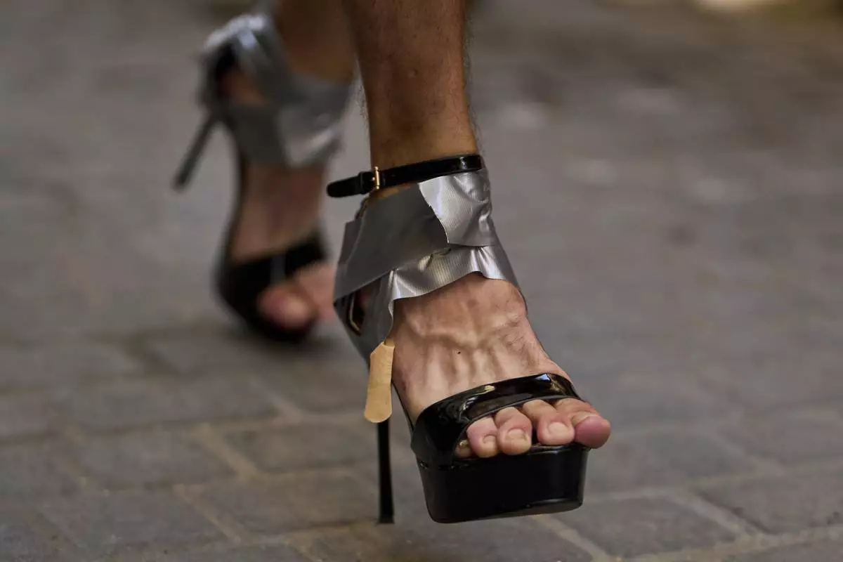 A participant wearing shoes with heels of at least 15 centimeters (5.9 inches) prepares to compete in the annual high heel race during Madrid's Pride week, in Madrid, Spain, Thursday, July 3, 2025. (AP Photo/Manu Fernandez)