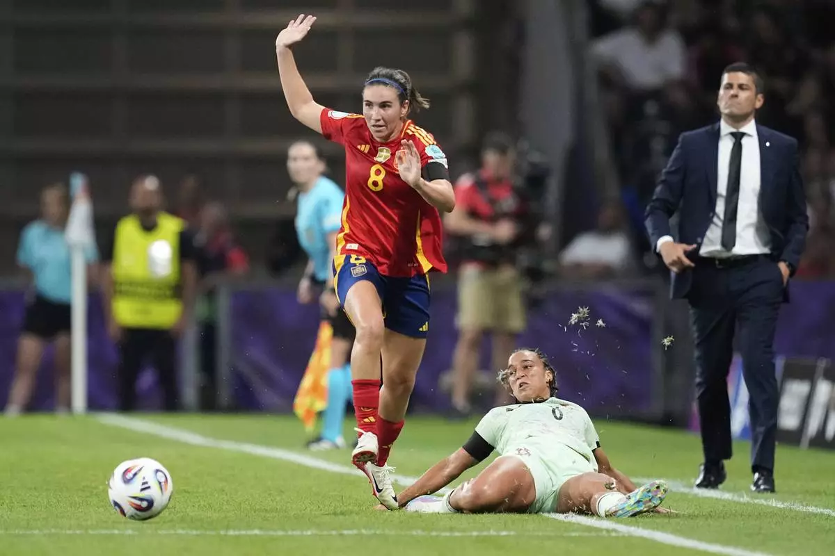 Portugal head coach Francisco Neto watches as Portugal's Andreia Norton tries to tackle Spain's Mariona Caldentey, left, during the Euro 2025, group B, soccer match between Spain and Portugal at Stadion Wankdorf in Bern, Switzerland, Thursday, July 3, 2025. (AP Photo/Martin Meissner)
