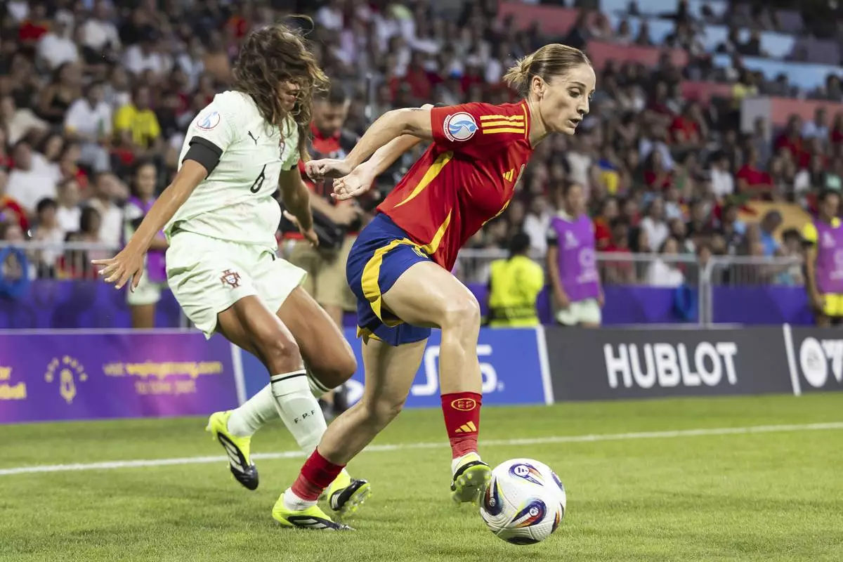 Portugal's Ana Borges and Spain's Mariona Caldentey, right, during the Euro 2025, group B, soccer match between Spain and Portugal at Stadion Wankdorf in Bern, Switzerland, Thursday, July 3, 2025. (AP Photo/Martin Meissner)