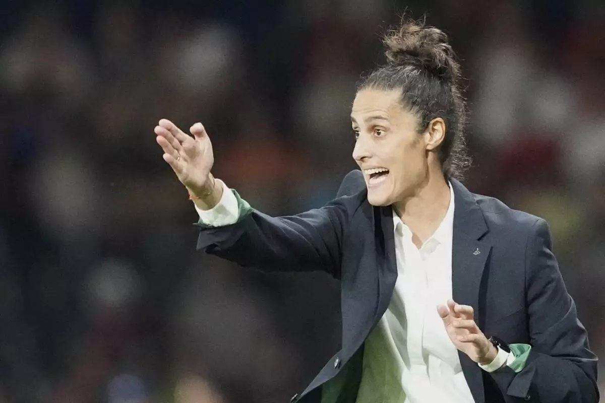Spain head coach Montserrat Tome gestures during the Euro 2025, group B, soccer match between Spain and Portugal at Stadion Wankdorf in Bern, Switzerland, Thursday, July 3, 2025. (AP Photo/Martin Meissner)
