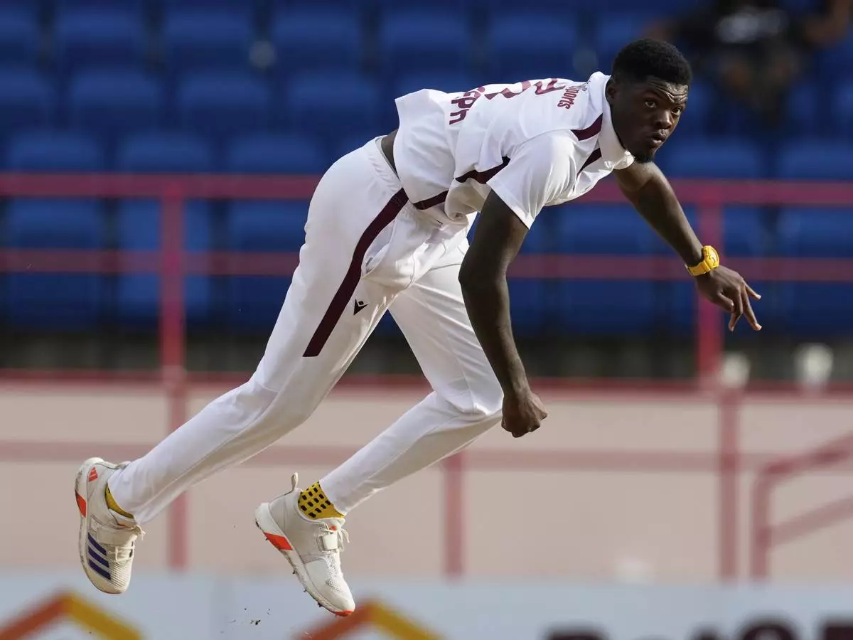 West Indies' Alzarri Joseph bowls against West Indies during day one of the second cricket Test match at National Cricket Stadium in St. George's, Grenada, Thursday, July 3, 2025. (AP Photo/Ricardo Mazalan)
