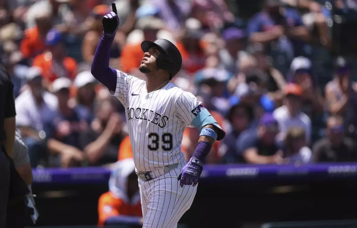 Colorado Rockies' Thairo Estrada gestures as he circles the bases after hitting a two-run home run against Houston Astros starting pitcher Brandon Walter in the first inning of a baseball game, Thursday, July 3, 2025, in Denver. (AP Photo/David Zalubowski)