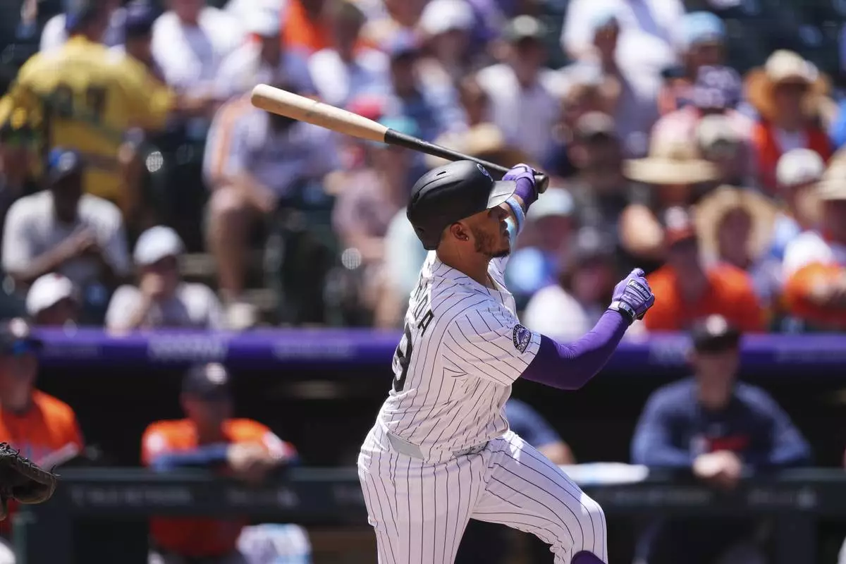 Colorado Rockies' Thairo Estrada follows the flight of his two-run home run off Houston Astros starting pitcher Brandon Walter in the first inning of a baseball game Thursday, July 3, 2025, in Denver. (AP Photo/David Zalubowski)
