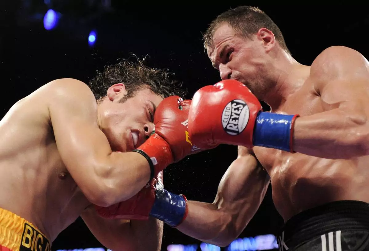 FILE - Sebastian Zbik of Germany connects with Julio Cesar Chavez, Jr. of Mexico during their WBC World Middleweight title boxing match, in Los Angeles, June 4, 2011. Chavez, Jr. won by majority decision. (AP Photo/Mark J. Terrill, File)