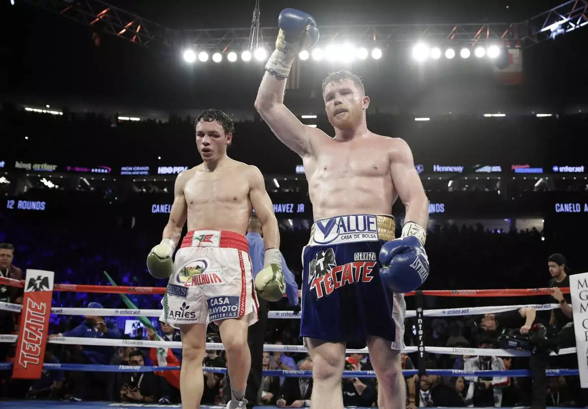 FILE - Canelo Alvarez, of Mexico, right, celebrates after defeating Julio Cesar Chavez Jr., of Mexico, in a catch weight boxing match in Las Vegas, May 6, 2017. (AP Photo/John Locher, File)