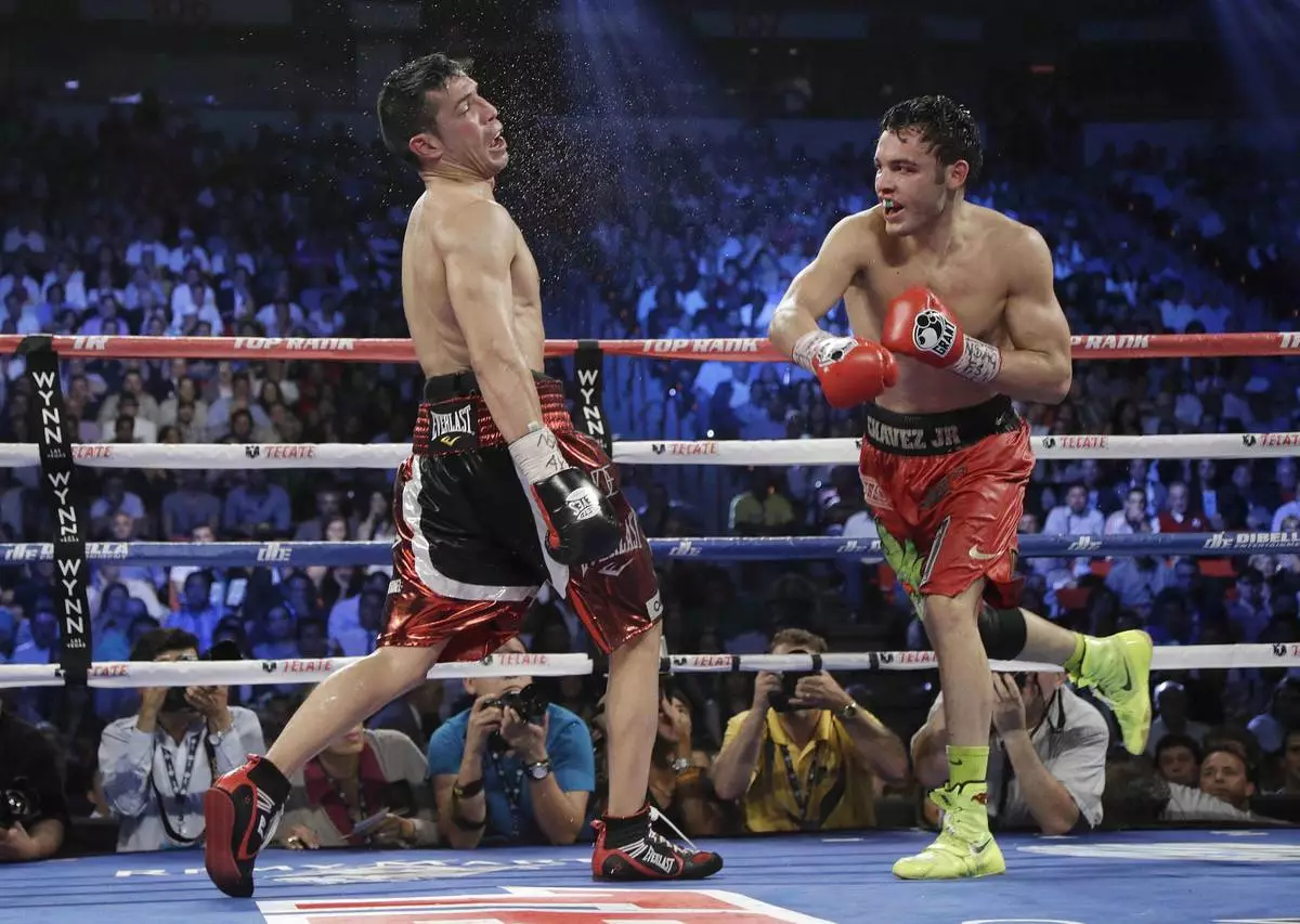 FILE - Canelo Alvarez, right, of Mexico, hits Julio Cesar Chavez Jr., of Mexico, during their catch weight boxing match, in Las Vegas, May 6, 2017. (AP Photo/John Locher, File)