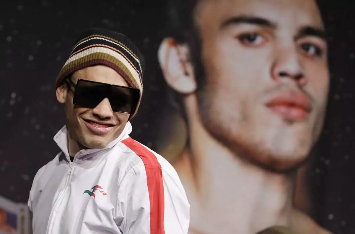 FILE - Boxers Cesar Chavez Jr,, left, smiles towards his father Julio Cesar Chavez, Mexico's former world champion, during a boxing news conference at the Avalon Hollywood Theatre in Los Angeles, May 14, 2025. (AP Photo/Damian Dovarganes, File)