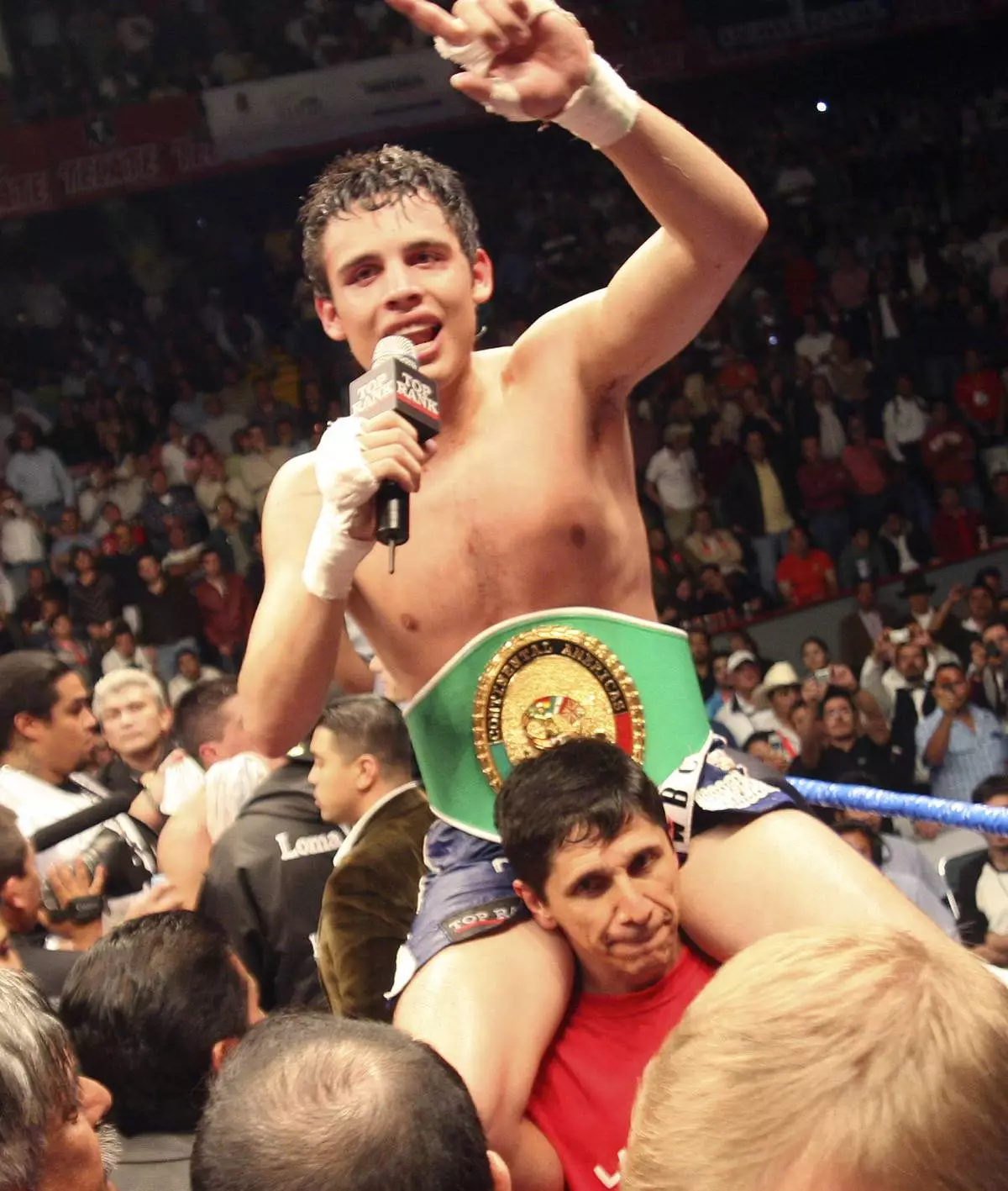FILE - Mexican boxer Julio Cesar Chavez Jr. top, celebates with his team after defeating with U.S. Jose Celaya during their Continental Americas super welterweight title fight of the World Boxing Council (WBC) in Leon, Mexico, Feb. 9, 2008. (AP Photo/Mario Armas, File)