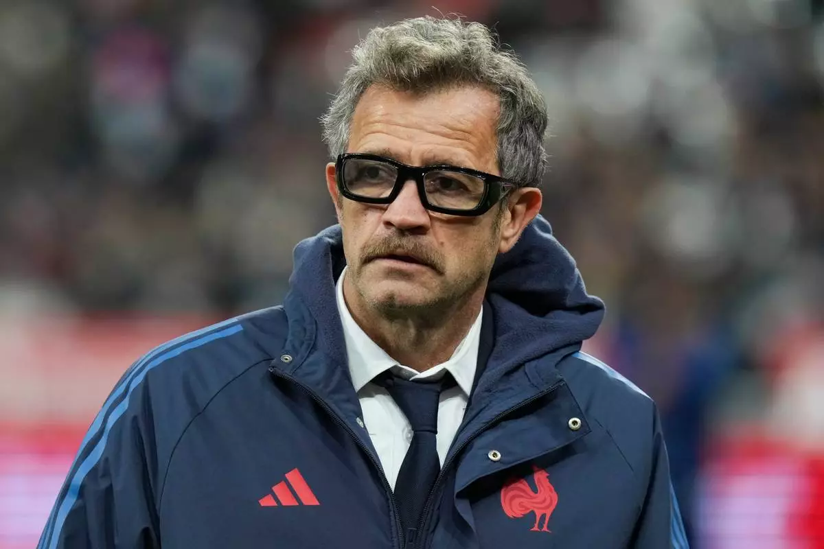 FILE - France's coach Fabien Galthié watches as his players warm up ahead of the Autumn Nations Series rugby international between France and Argentina at the Stade de France stadium at Saint-Denis on the outskirts of Paris, Friday, Nov. 22, 2024. (AP Photo/Thibault Camus, File)