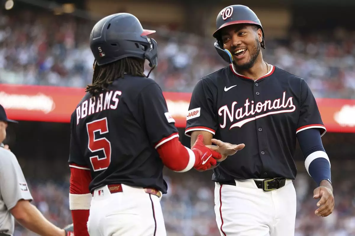 Washington Nationals' James Wood celebrates with Washington Nationals' CJ Abrams after scoring a run during the first inning of a baseball game against the Detroit Tigers, Thursday, July 3, 2025, in Washington. (AP Photo/Daniel Kucin Jr.)