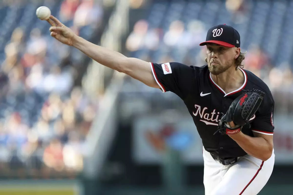 Washington Nationals pitcher Jake Irvin throws during the first inning of a baseball game against the Detroit Tigers, Thursday, July 3, 2025, in Washington. (AP Photo/Daniel Kucin Jr.)