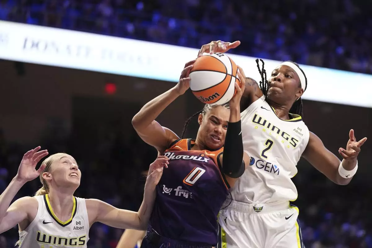 Phoenix Mercury's Satou Sabally (0) compete to control a rebound against Dallas Wings' Paige Bueckers, left, and Myisha Hines-Allen (2) in the first half of a WNBA basketball game Thursday, July 3, 2025, in Arlington, Texas. (AP Photo/Tony Gutierrez)