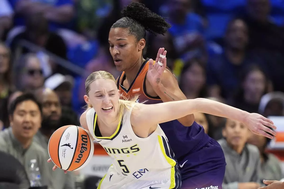 Dallas Wings' Paige Bueckers (5) controls the ball as Phoenix Mercury's Alyssa Thomas, right, defends in the first half of a WNBA basketball game Thursday, July 3, 2025, in Arlington, Texas. (AP Photo/Tony Gutierrez)