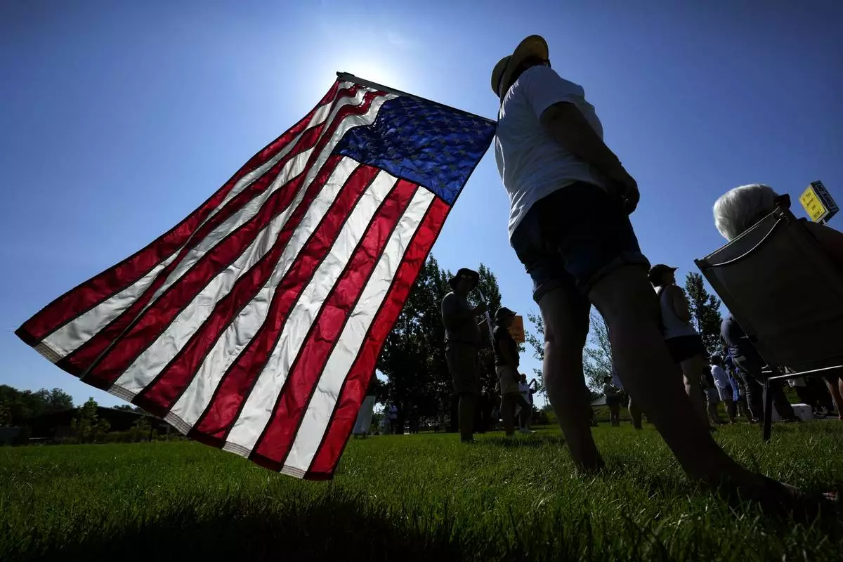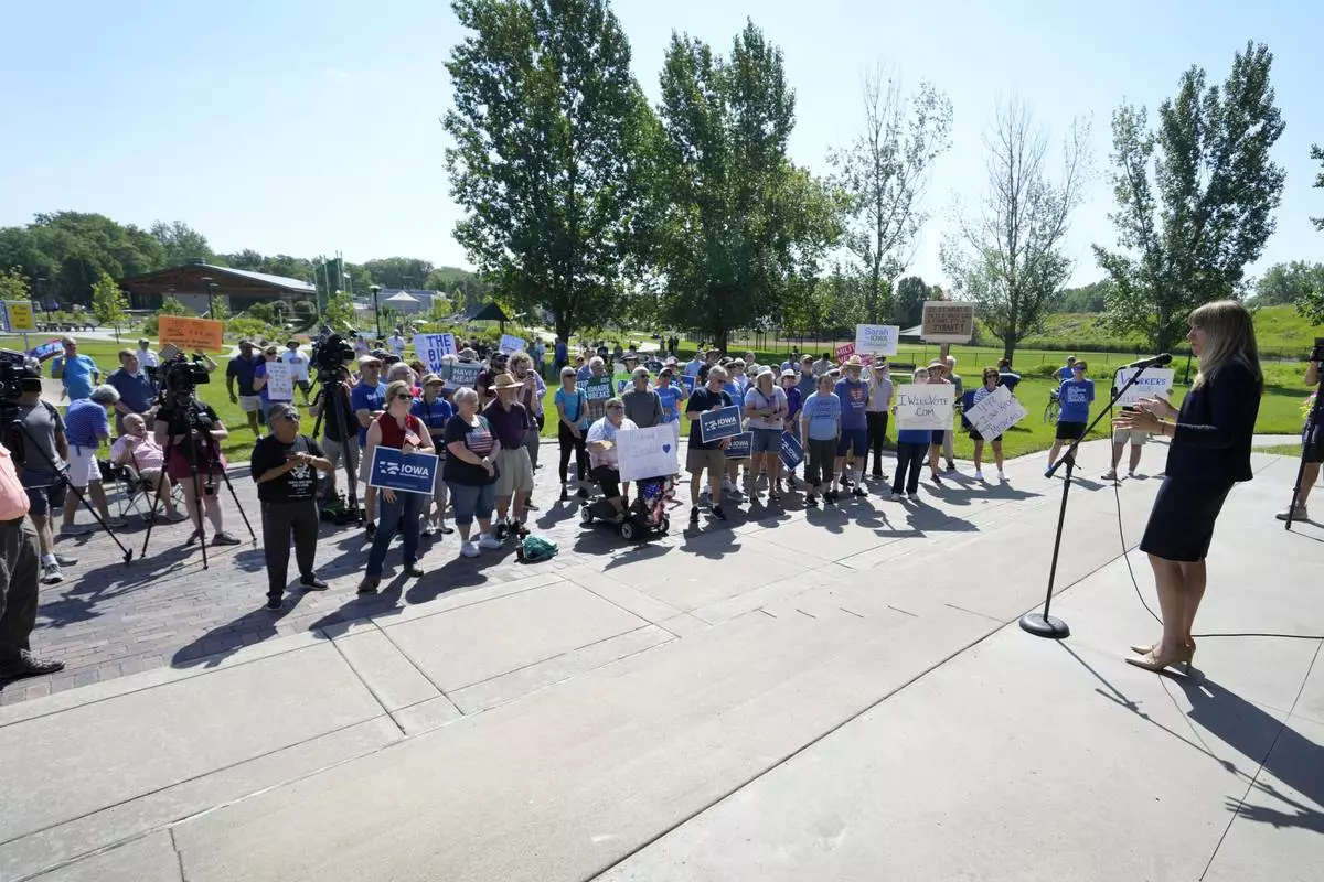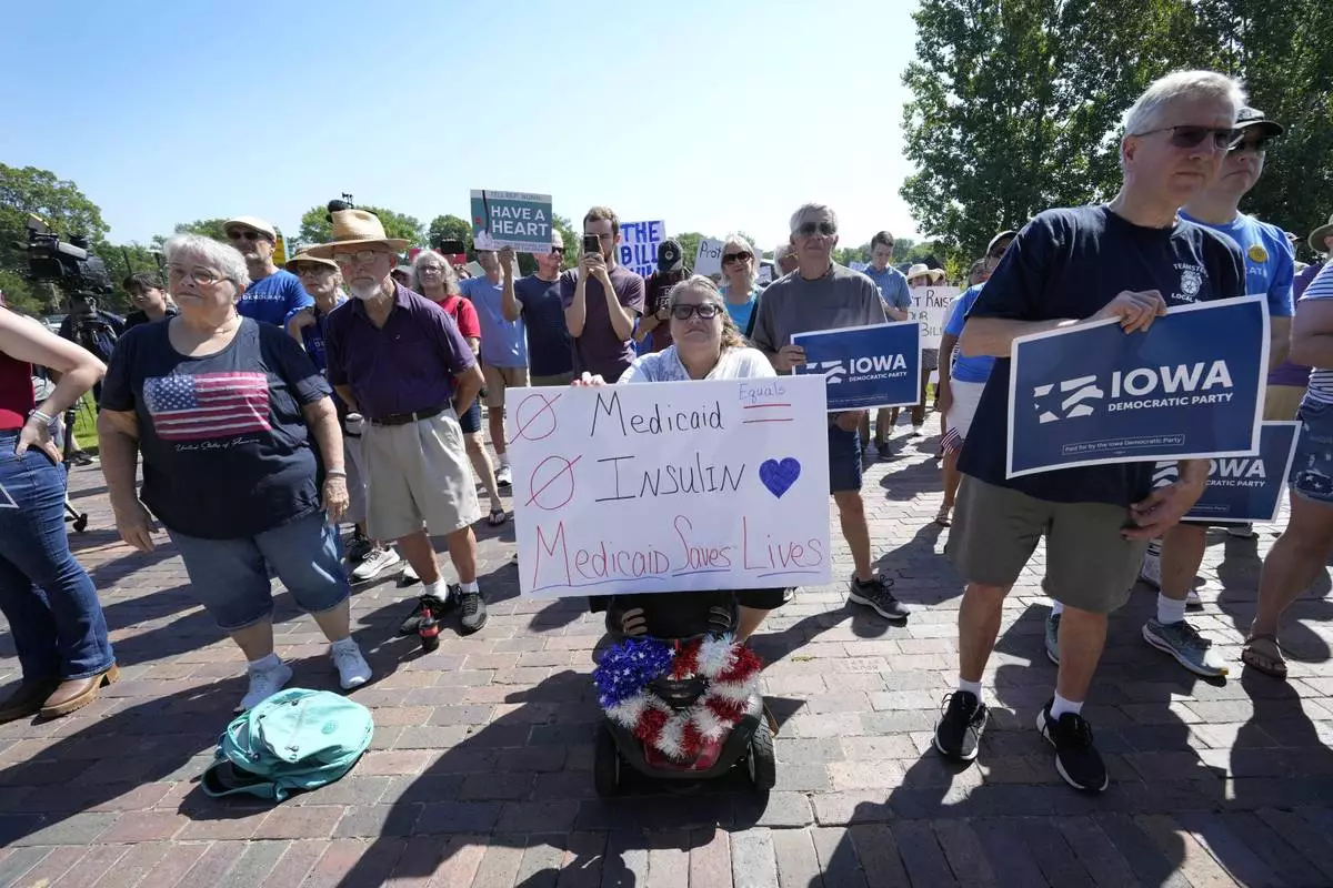 Local residents listen to a speech during an Iowa Democratic Party rally, Thursday, July 3, 2025, in Windsor Heights, Iowa. (AP Photo/Charlie Neibergall)