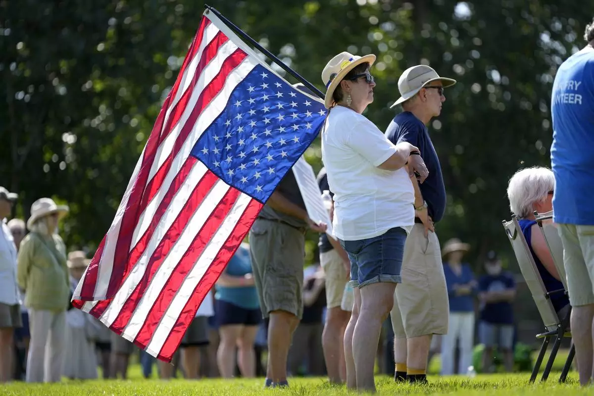 A local resident listen to a speech during an Iowa Democratic Party rally, Thursday, July 3, 2025, in Windsor Heights, Iowa. (AP Photo/Charlie Neibergall)