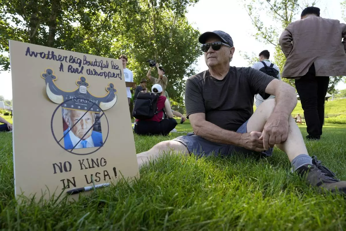 Dana Myers, of Des Moines, Iowa, waits for the start of an Iowa Democratic Party rally, Thursday, July 3, 2025, in Windsor Heights, Iowa. (AP Photo/Charlie Neibergall)