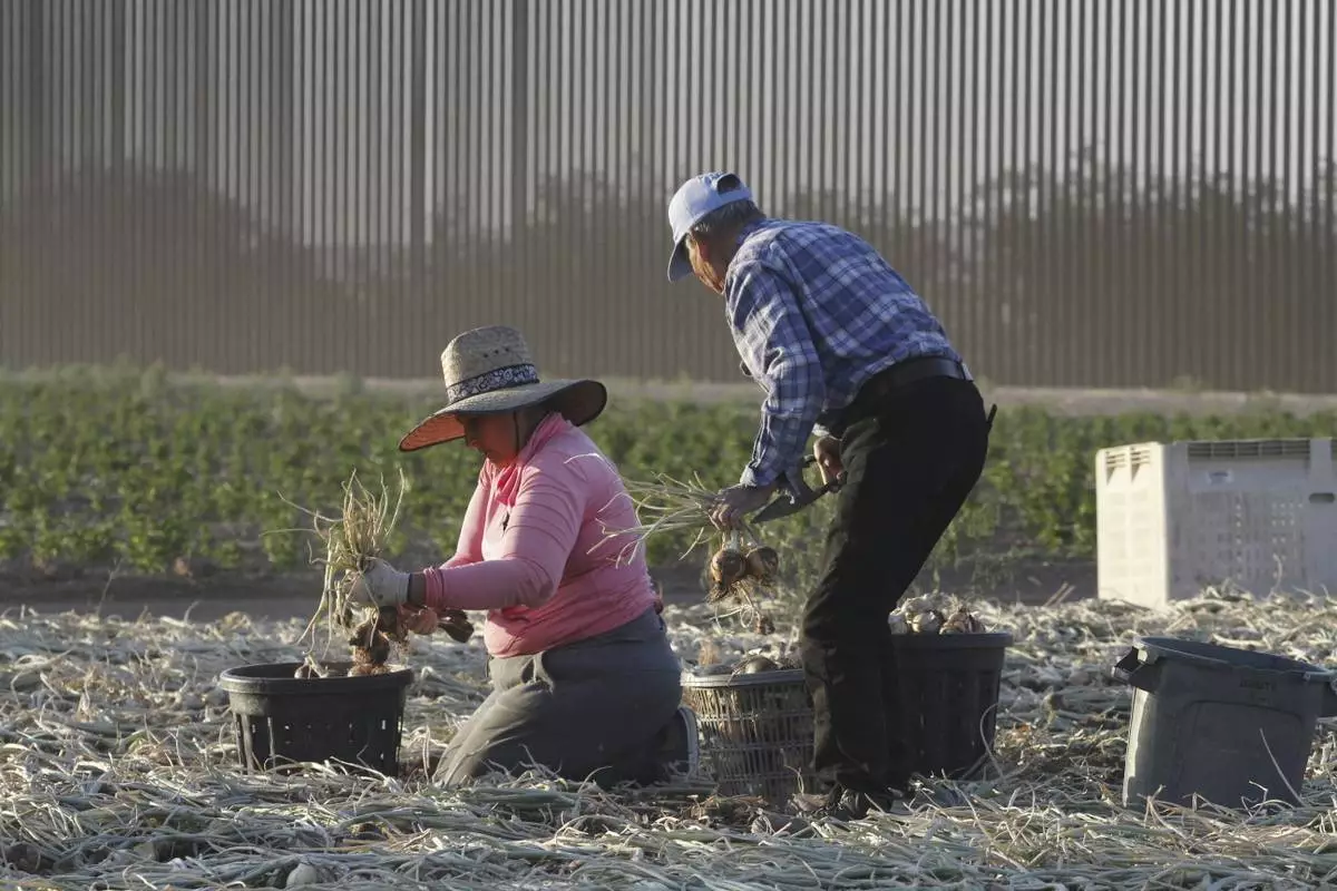 Seasonal laborers harvest onions on a privately owned ranch along the southern U.S. border in an unincorporated area 15 miles west of Columbus, N.M., on June 12, 2025. (AP Photo/Morgan Lee)