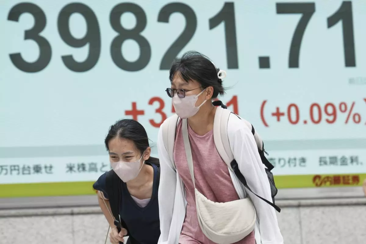 People walk in front of an electronic stock board showing Japan's Nikkei index at a securities firm Friday, July 4, 2025, in Tokyo. (AP Photo/Eugene Hoshiko)