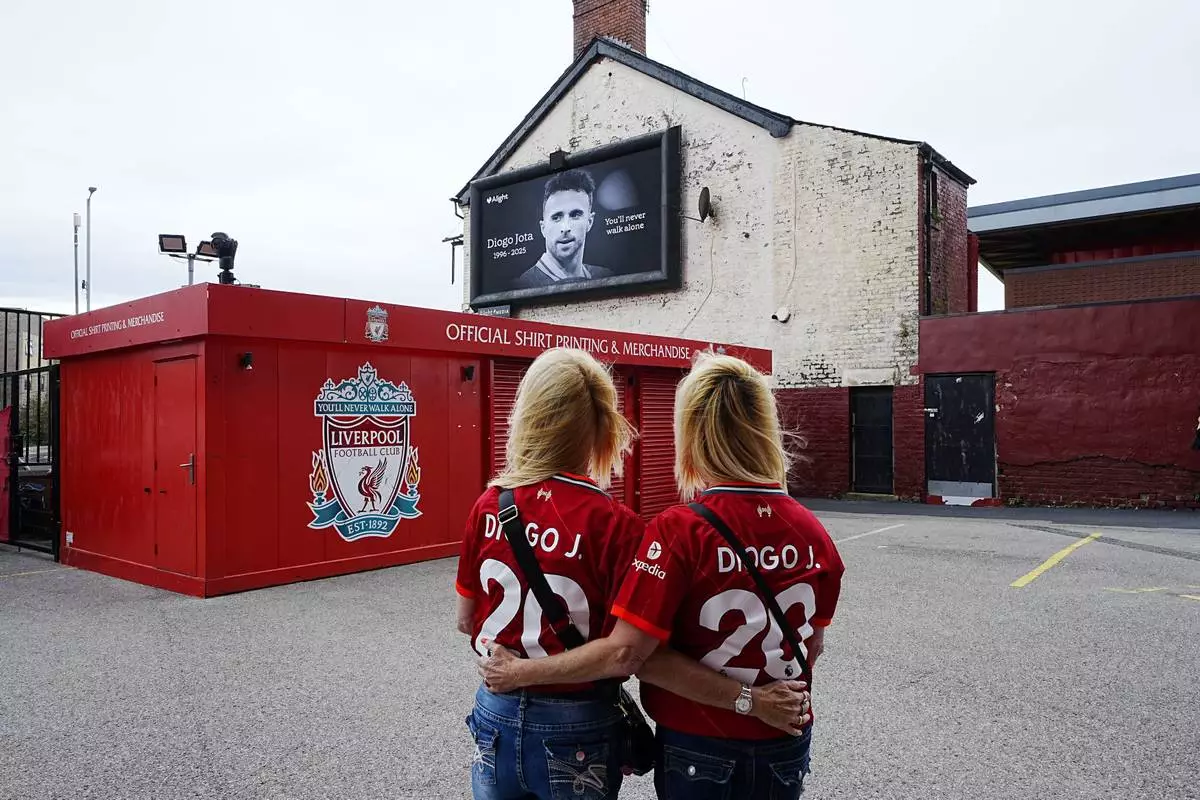 Liverpool supporters wearing shirts in memory of Diogo Jota at Anfield Stadium, home of Liverpool, who has died at the age of 28, in Liverpool, England, Friday July 4, 2025. (Peter Byrne/PA via AP)