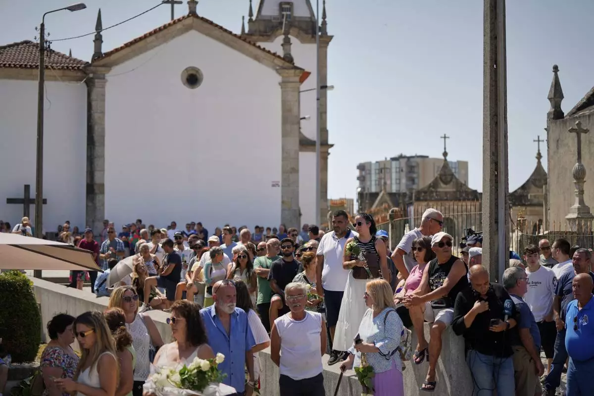 People gather at the church where the bodies of Liverpool forward Diogo Jota and André Silva have been brought for a wake and funeral in Gondomar, near Porto, Portugal, on Friday, July 4, 2025. (AP Photo/Manu Fernandez)