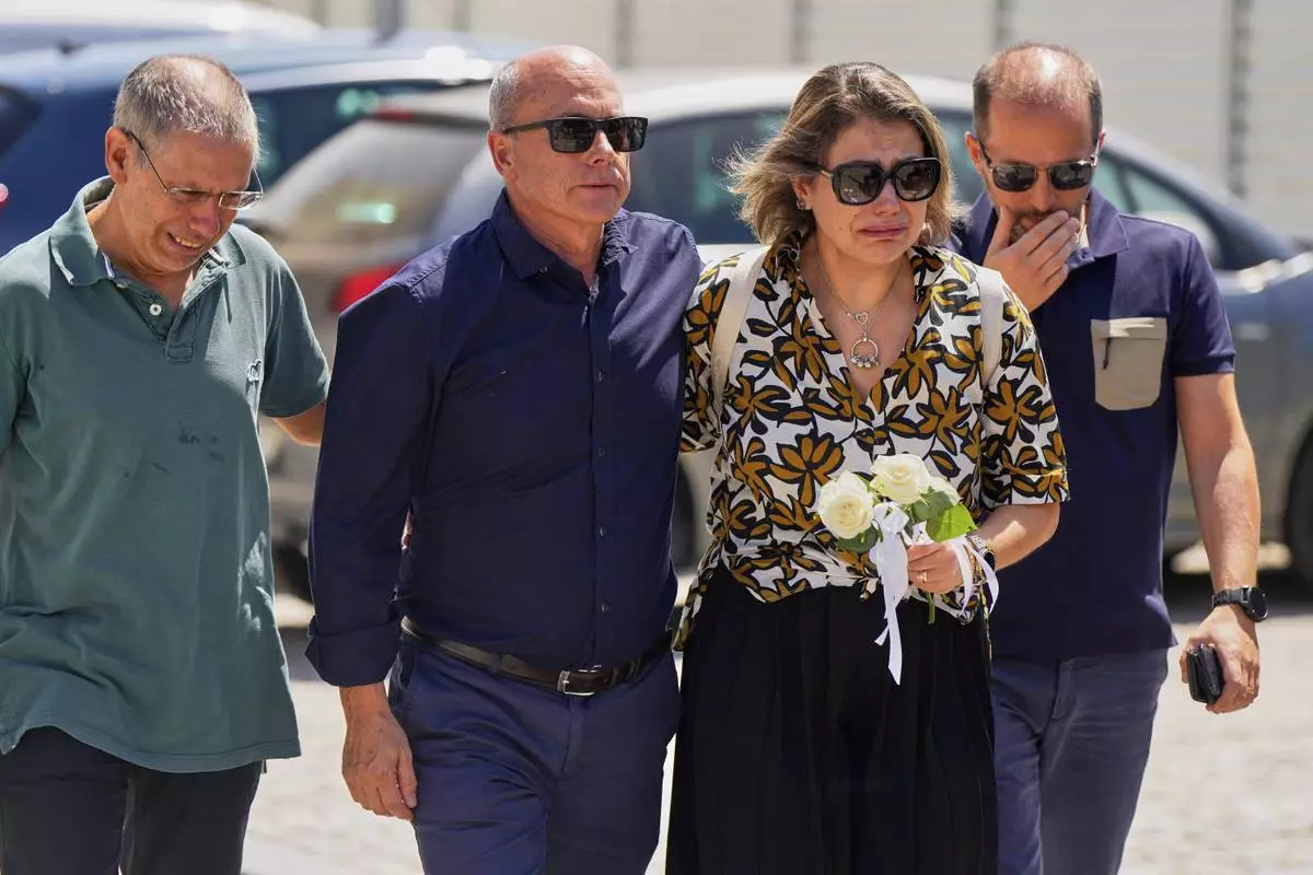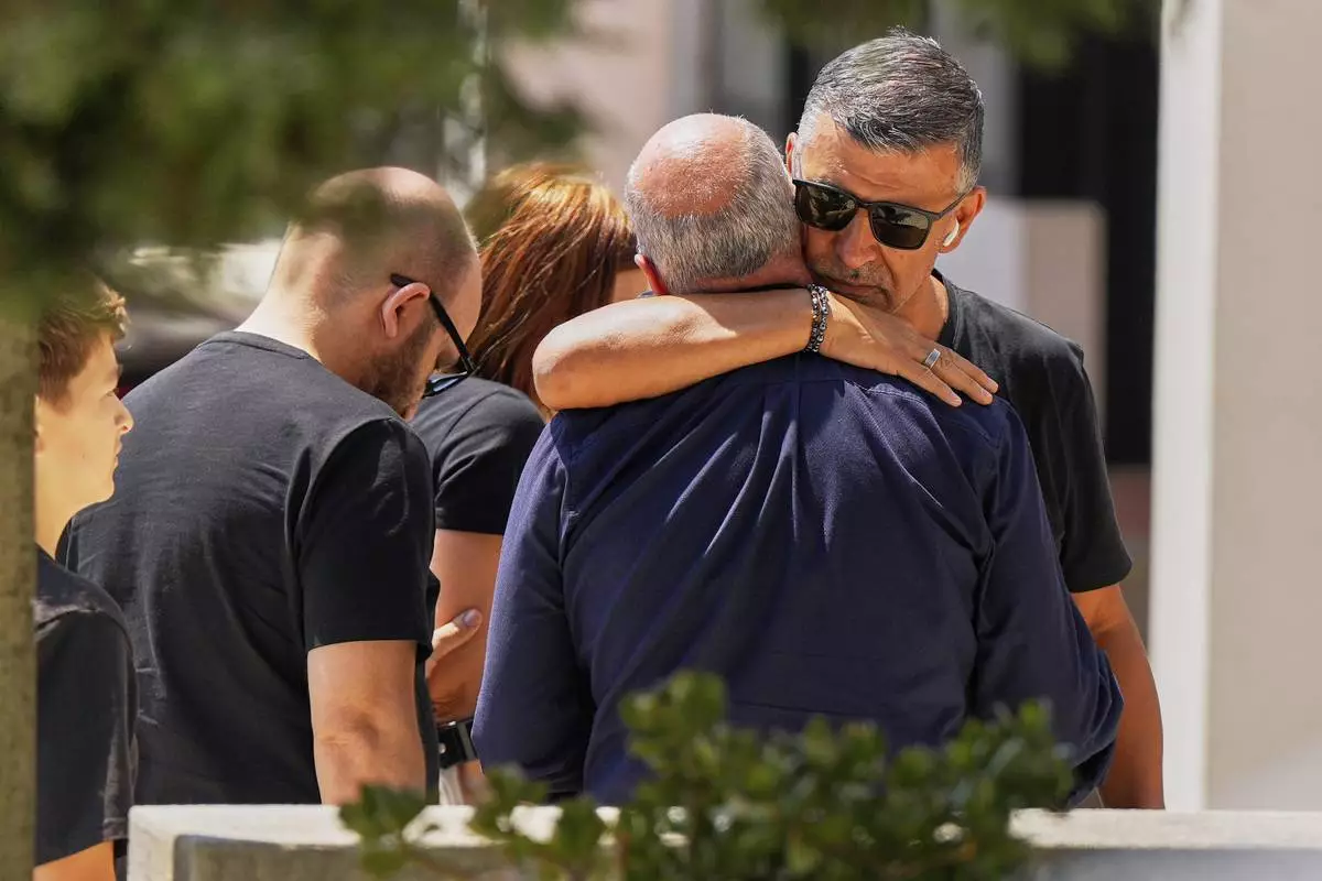 Joaquim, center, father of Liverpool forward Diogo Jota and his brother, arrives accompanied by other relatives at a church where their bodies have been brought for a wake and funeral, in Gondomar, near Porto, Portugal, on Friday, July 4, 2025. (AP Photo/Manu Fernandez)