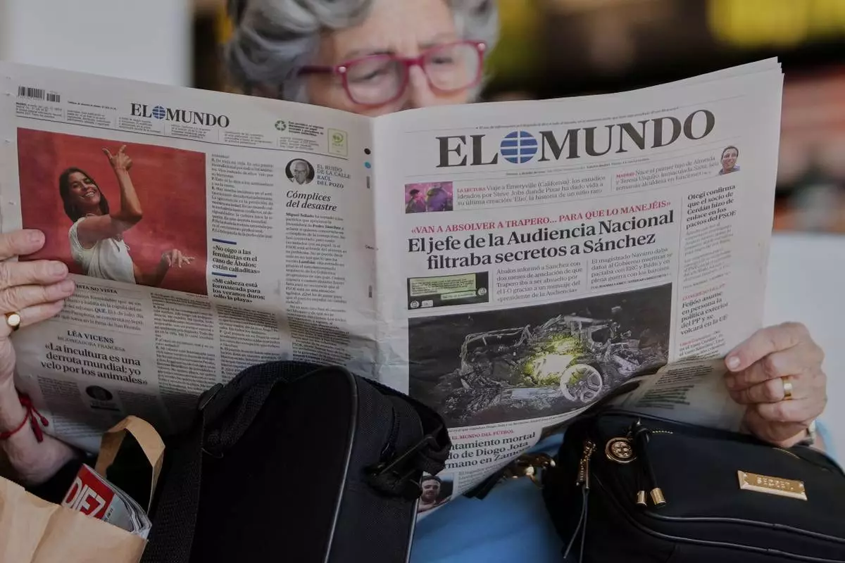 A woman at Adolfo Suarez Madrid-Barajas Airport in Madrid, reads a newspaper showing on its front page the car involved in the crash in which Liverpool player Diogo Jota and his brother died in the north-western city of Zamora, Spain, Friday, July 4, 2025. (AP Photo/Manu Fernandez)