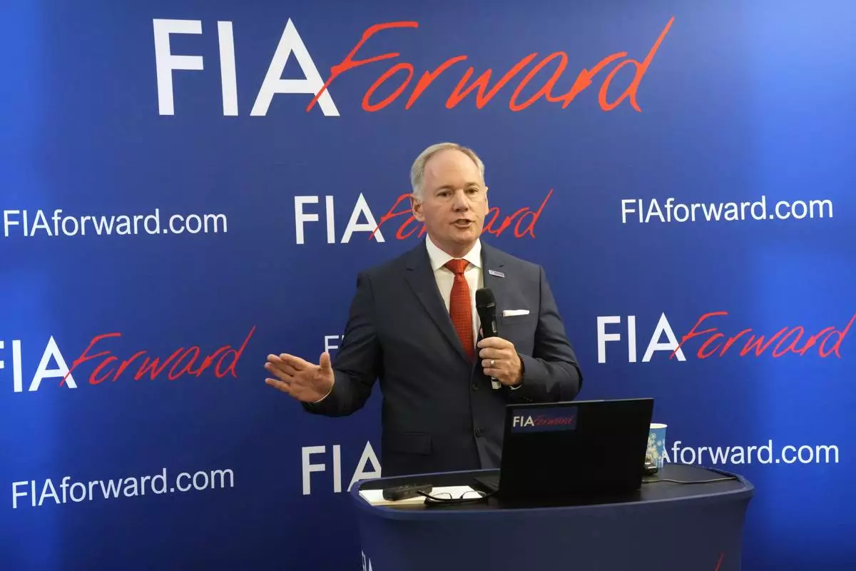 Tim Mayer, the son of former McLaren team principal Teddy Mayer addresses the media after announcing that he is running for the presidency of motorsport's governing body the FIA in December's election, in Whittlebury Park, England, Friday, July 4, 2025. (AP Photo/Darko Bandic)
