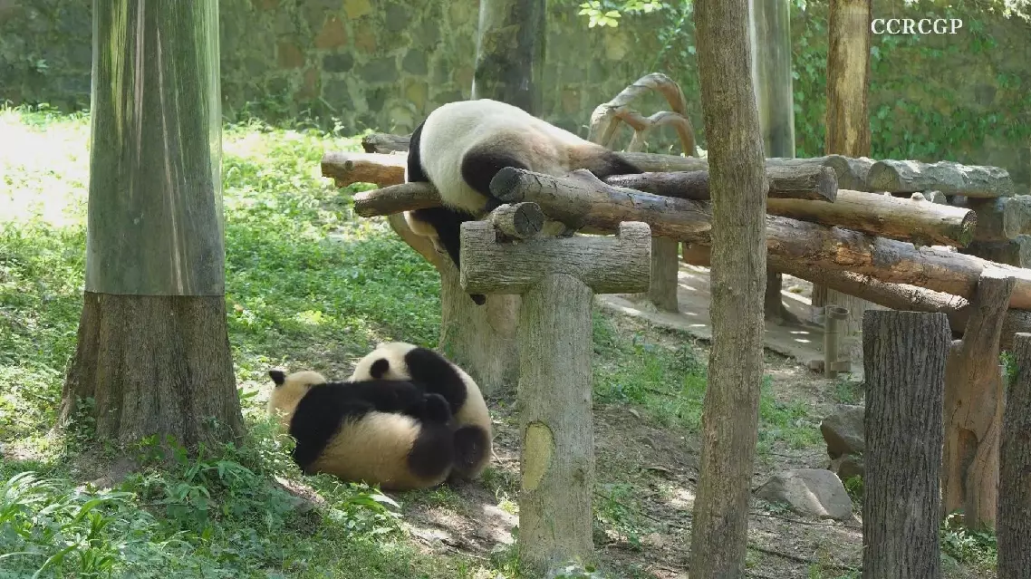 The first clip, recorded on June 11, shows pandas Rui Rui and Zi Rui playing on a wooden structure. On the ground, a mischievous male cub, Ao Ke, persistently bothers Zi Rui during her nap, slowly coaxing her to plop down and cuddle with him.