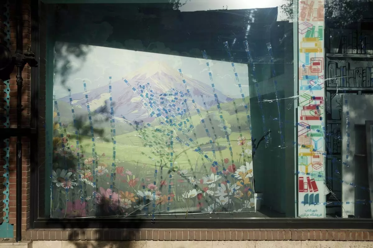 TThe front window of a well-known bookstore cracked after an explosion hit a nearby military site just behind the shop, in Tehran, Iran, Tuesday, June 24, 2025. Staff taped the glass to prevent further damage, creating the outline of Iran over a mural of Mount Damavand, a national symbol of resilience. (AP Photo)