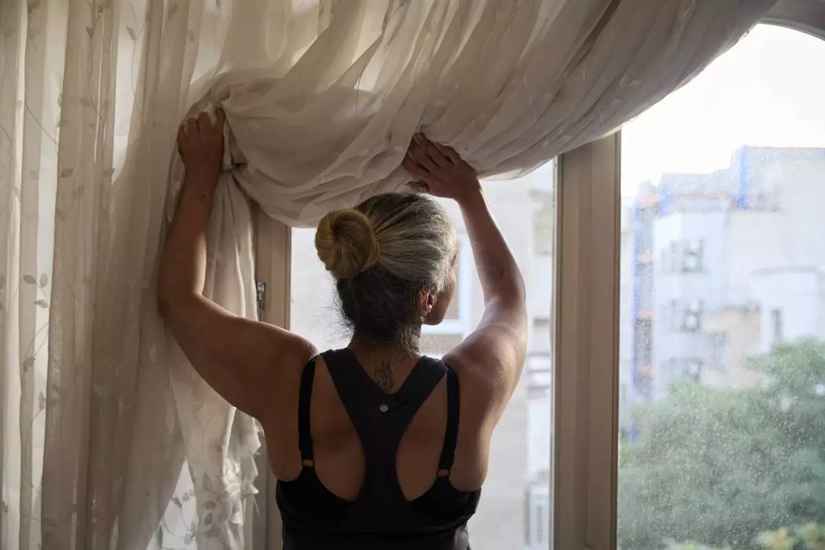Maryam, who has the word "Iran" tattooed on the back of her neck, looks out the window of her home in Tehran, Iran, Wednesday, June 25, 2025. She lives alone with her daughter, Mastaneh, just a few blocks from the site of a key explosion during the war.(AP Photo)