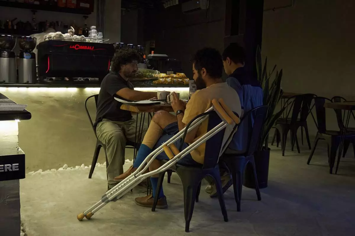 Three young men gather in one of the few cafés that stayed open during the war as the thuds of defense missiles echo outside in Tehran, Iran, Wednesday, June 18, 2025. (AP Photo)