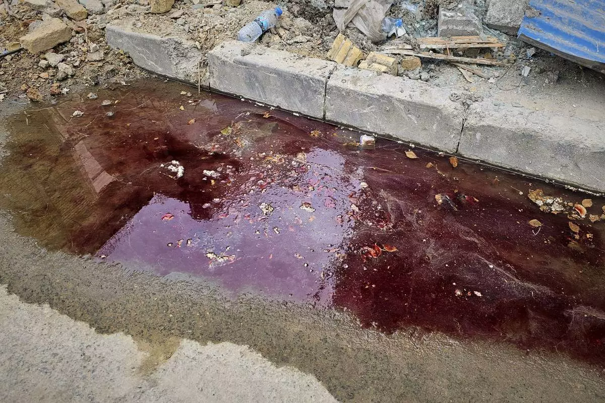 Blood at the site of an Israeli strike stains the roadside two days later in Tehran, Iran, Friday, June 27, 2025. (AP Photo)