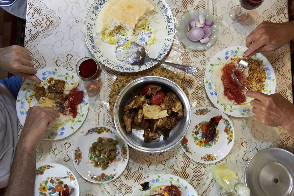 A family gathers for dinner in the town of Rasht, northwest of Tehran near the Caspian Sea, Friday, June 20, 2025, once considered safer than the capital. Midway through the war, three explosions shook the city, shattering its sense of safety. (AP Photo)
