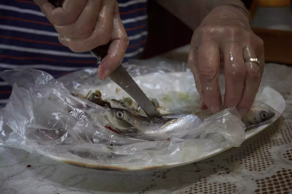 A woman cuts a fish as she prepares dinner for her family in Rasht, northwest of Tehran near the Caspian Sea, Friday, June 20, 2025. Once considered safer than the capital, the city's sense of security was shattered midway through the war when explosions struck. (AP Photo)