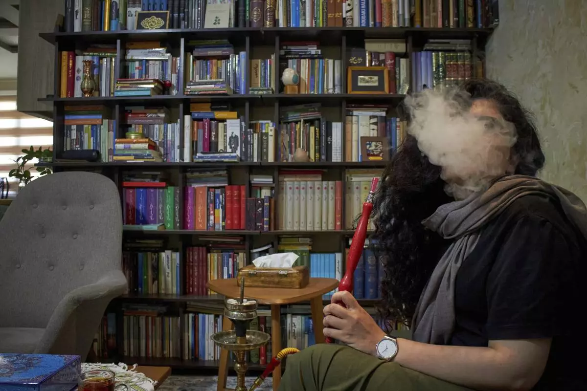In a city emptied by war, a woman smokes hookah with a friend at home in Tehran, Iran, Tuesday, June 17, 2025. (AP Photo)