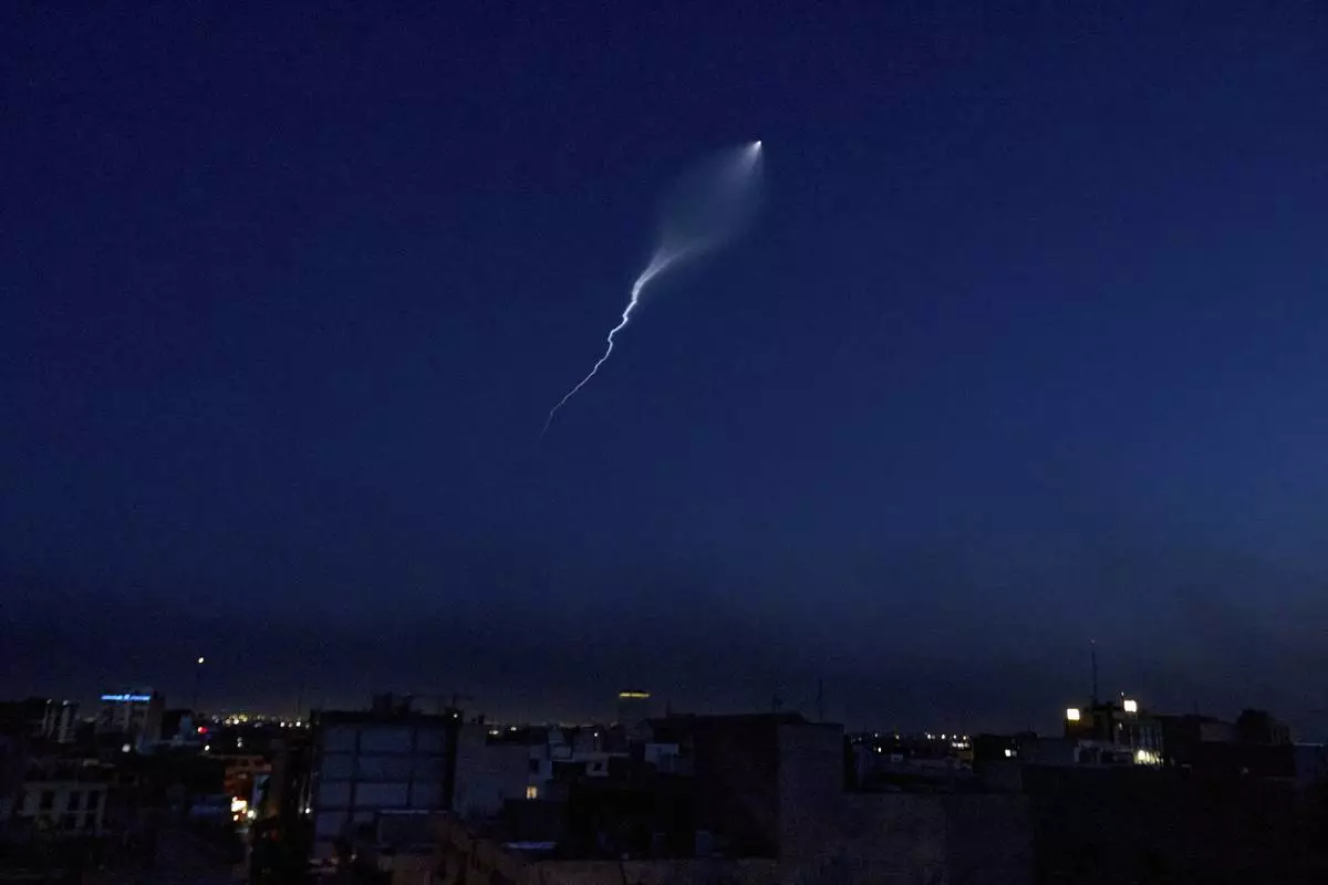 The trail of a missile launched by Iran is visible across the sky in Tehran, Iran, Wednesday, June 18, 2025. Most of the city's lights were off, some areas had been evacuated, and others remained dark intentionally. (AP Photo)