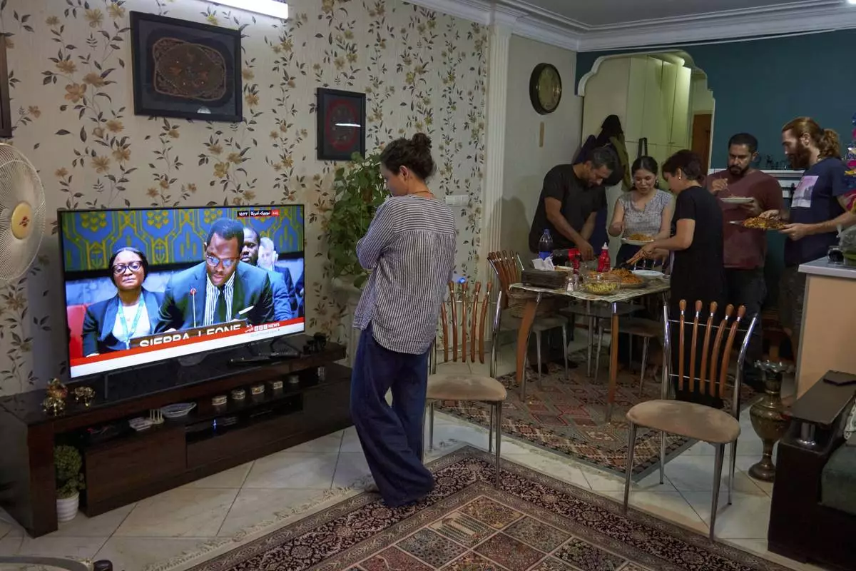 A group of friends gathers for dinner while following the TV for the latest updates on the Iran-Israel conflict in Tehran, Iran, on Monday, June 23, 2025. (AP Photo)